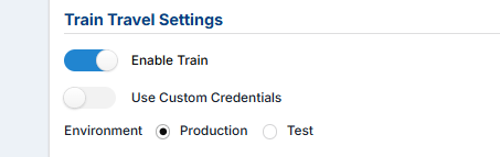 | Use Custom Credentials | If there are any specific credentials that need to be set for the Train Travel, they need to be set in this field. |