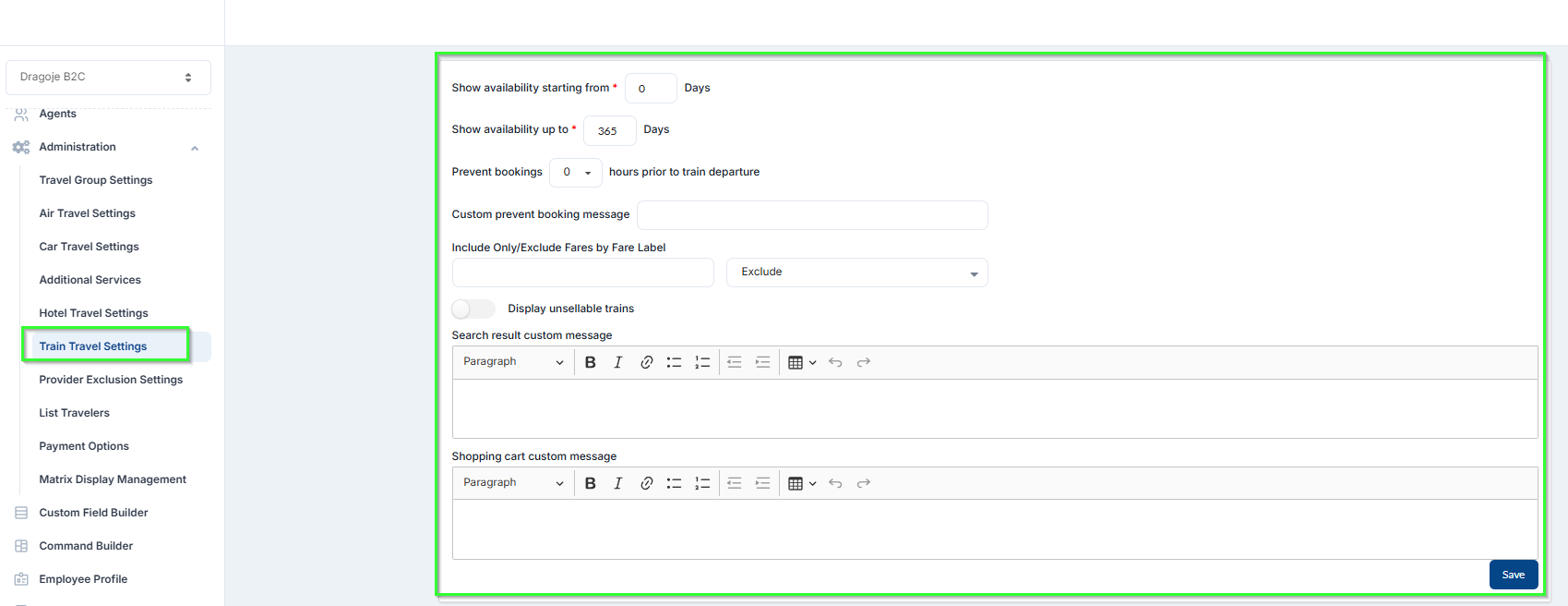 Now, we can access our Administration Options and see that the Train Travel Settings have appeared: